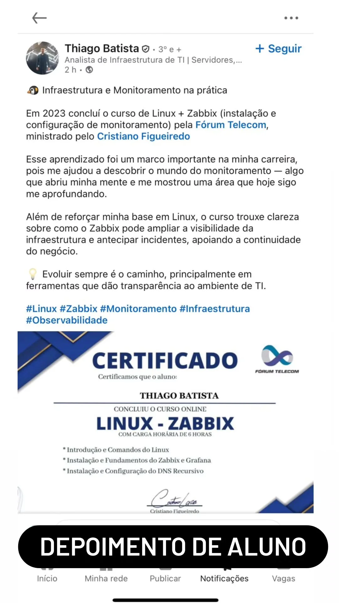 O Fórum Telecom tem mais de 10 mil alunos no Brasil e no exterior. O certificado comprova 65 horas de formação prática em Analista de Redes.